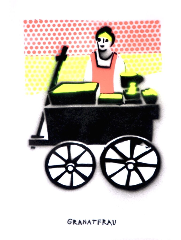 einige Männer mit ihren Handkarren durch die Stadt und warben für ihr Produkt. Mutter