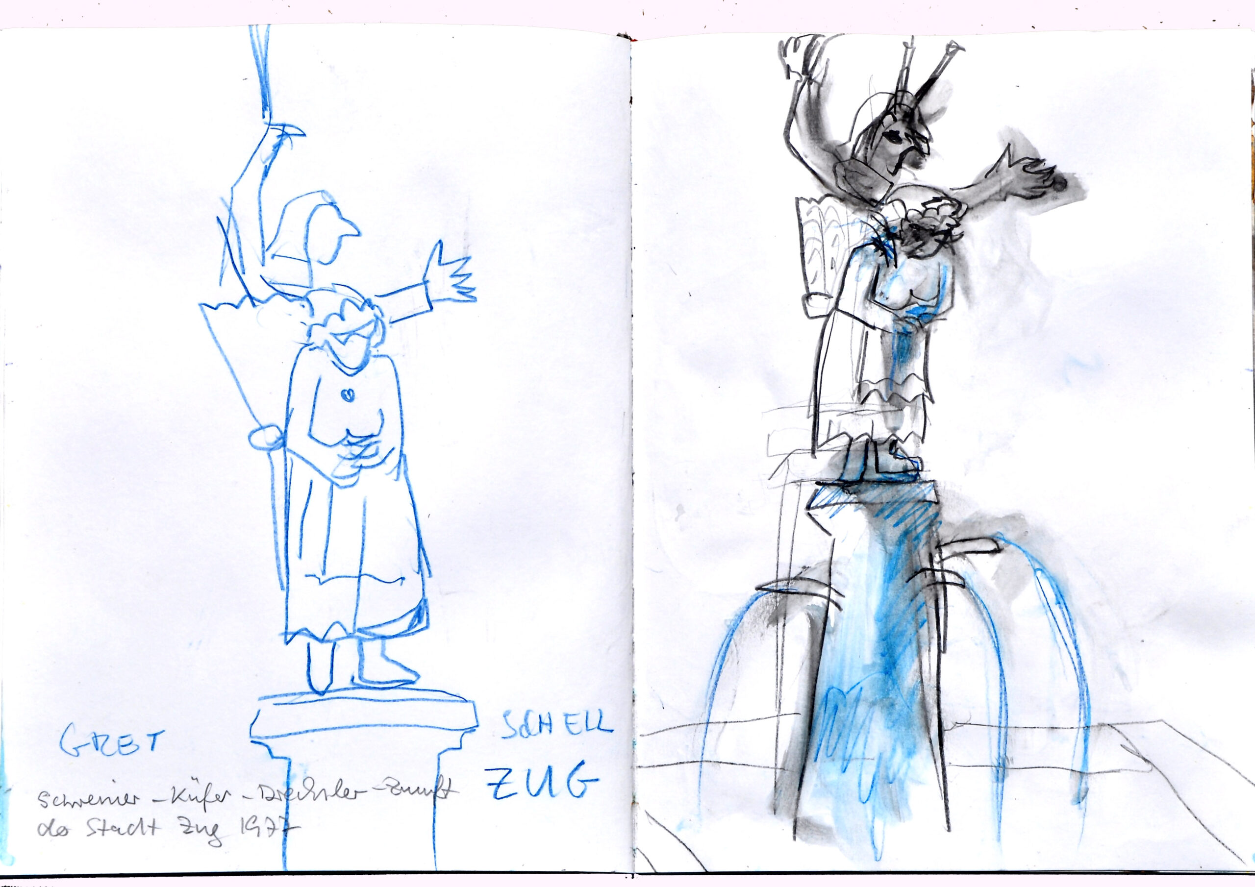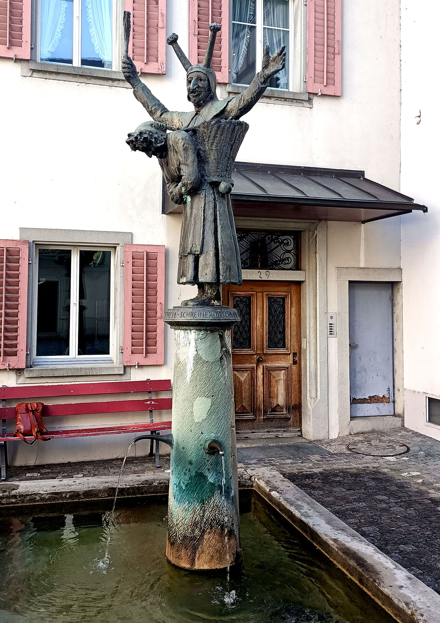 Wirtshäusern abholt und in einer «Chrätze» (Rückentragkorb) nach Hause schleppt – begleitet von den «Lölis», den nicht minder angeheiterten Saufkumpanen. Der Fasnachtsfigur Greth Schell ist in der Unter Altstadt ein gegen Ende des 18. Jahrhunderts errichteter Brunnen gewidmet. Die Figur auf dem Brunnen wurde durch die Zunft der Schreiner, Drechsler und Küfer der Stadt Zug gestiftet.