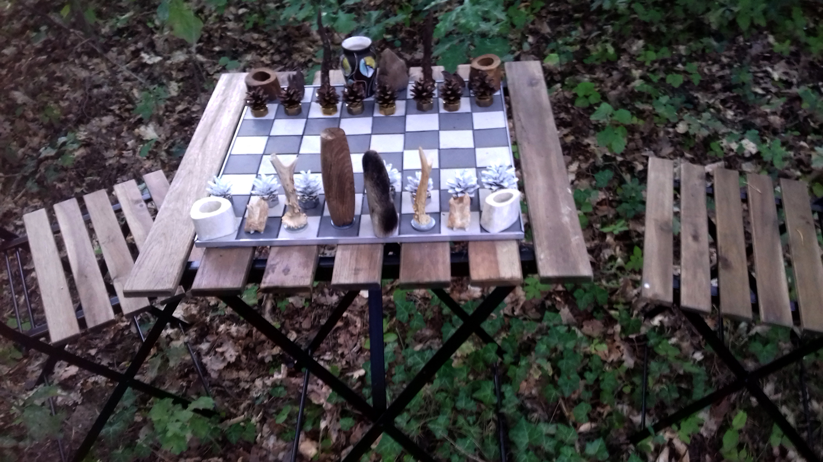 In meinem Atelier auf einem kleinen Waldgrundstück in Grünheide beschäftige ich mich neben meiner Kunst mit dem Schachspiel. Dort habe ich das WALDSCHACH gebaut: einen Tisch schwarz-weiß gefliest und die Schachfiguren aus den gefundenen Naturmaterialien geformt. Manchmal kommen NachbarInnen zum Schachspielen. Die Verbindung zwischen Intellekt, Spiel und Kommunikation hat schon viele KünstlerInnen fasziniert.